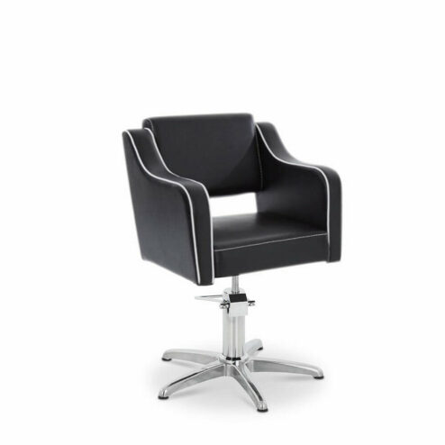 Direct Salon Supplies Miami Hydraulic Styling Chair. Finished in a black upholstery with white contrast piping on the edges, comes on a 5 star hydraulic locking base.
