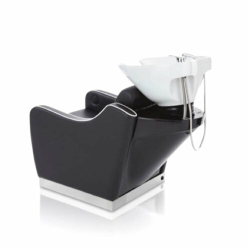 Direct Salon Supplies Roma Washpoint Complete. A high quality, stylish Washpoint with an well-finished upholstered chair finished in black upholstery with white contrast piping and with a black base cabinet and white tilting basin with mixer tap and hose.