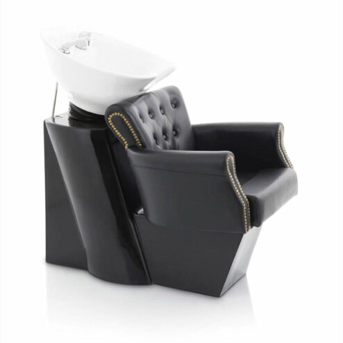 Direct Salon Supplies Venus Washpoint Complete, a high quality stylish Washpoint with a well-finished upholstered chair finished in black plain upholstery with button back and studded edge detail with a black base cabinet and deep white tilting basin with mixer tap and hose.