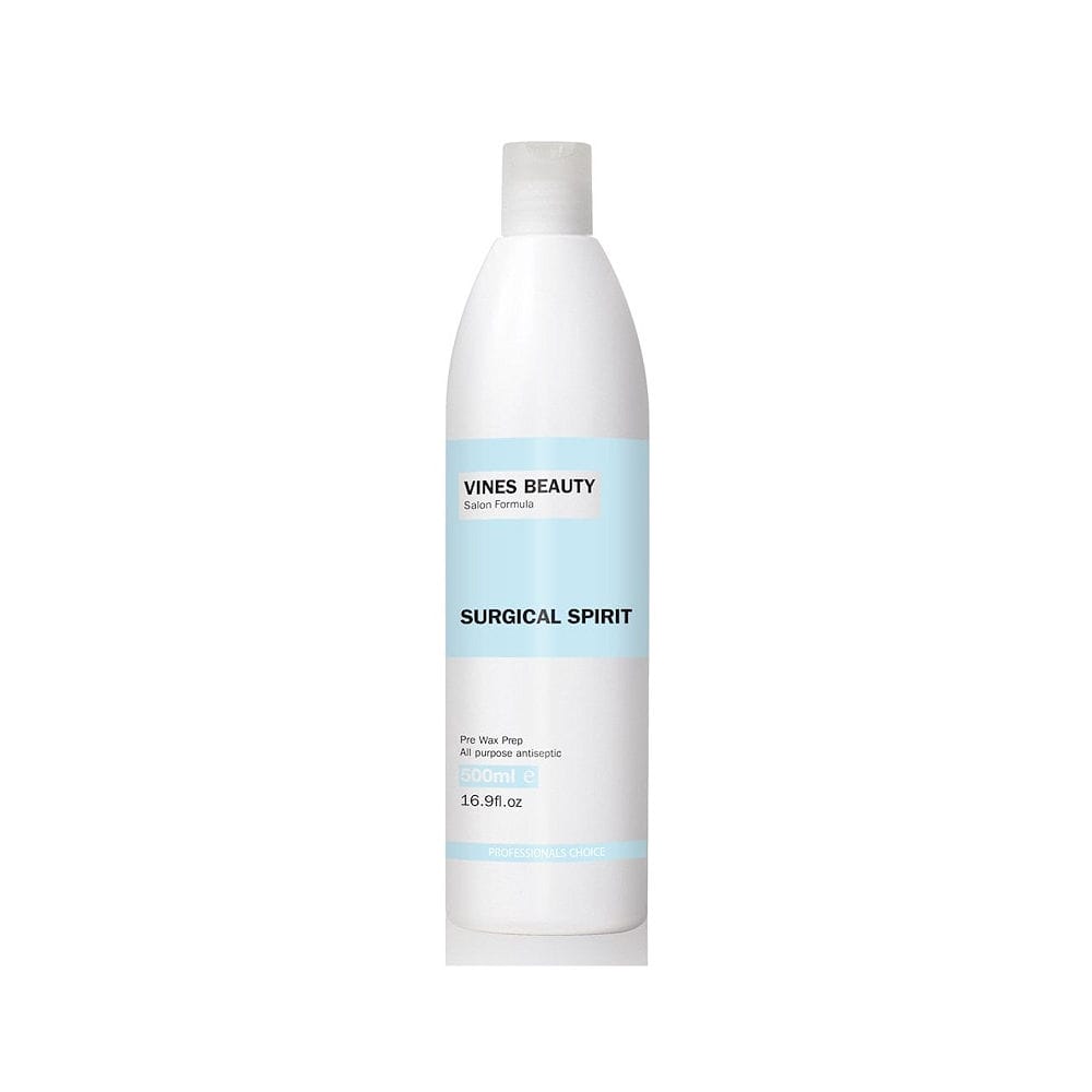 Vines Surgical Spirit 500ml. Classic antiseptic that’s perfect for preparing skin for waxing, piercing or tattooing and also for disinfecting your tools and appliances.
